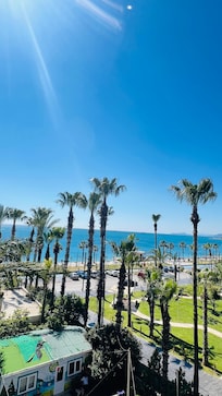 The hotel was so nice and positioned right opposite the beach . It's a lovely modern hotel with an airy hotel entrance lobby with a cocktail bar and lots of comfy seating ideal for people watching! The room was lovely and cool with a huge bed and a small balcony with a sea view to the side. The outside pool area was also nice and relaxing and was set in a garden area with waiter service for drinks including alcoholic drinks , tea and coffee. There were plenty of sunbeds available and an underground walkway over to the beach! There is an indoor pool with a great gym, Turkish sauna and steam room and Turkish massages are also available at an extra cost. There is a hairdressers and a Doctor on site. The food on offer was amazing with so much choice and all freshly cooked. At breakfast freshly made omelettes and pancakes were on offer. During the day and evening there were plenty of local dishes which were so nice, lots of hot dishes, salads, fruit and desserts.