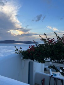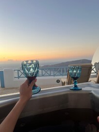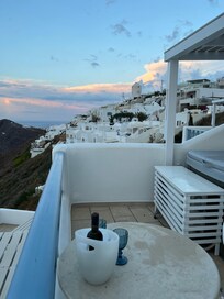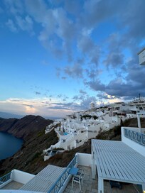 The moment we arrived we were met by a staff member that carried our very heavy bags down the steps to reception. We were greeted by Penny and Sofia who offered us a glass of wine and then showed us down more steps to our beautiful room. It was so much better than I had expected. The view was beyond belief! A bottle of wine of our choice was brought to our room along with a menu for breakfast that was delivered right on time each morning. The breakfast was amazing. The rooms was spotless and well appointed. The day we left our departure as at 4am. A large, cold breakfast was delivered along with coffee and tea at 3:15 and again our bags were carried to our rental car. You could not ask for a better value for your money. There are so many places to see in this world, that I am not sure I will return to Santorini, but if I do I will stay at Absolute Bliss!